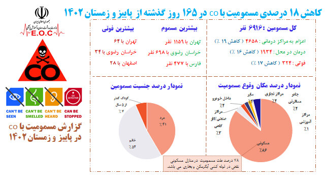 در بخش فوتیهای ناشی از گاز مونوکسیدکربن نیز استان تهران با ۶۴ مورد، خراسان رضوی با ۳۴ مورد و اصفهان با ۲۸ مورد فوت در ردههای اول تا سوم میزان فوتیهای ناشی از این استنشاق این گاز را دارند.