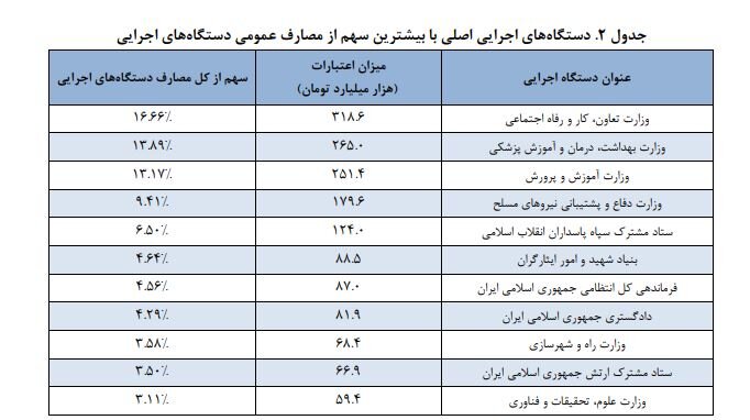 در این میان نگاهی به سهم قوه مقننه از بودجه دستگاههای اجرایی بیانگر آن است که وزارت تعاون، کار و رفاه اجتماعی، وزارت بهداشت درمان و آموزش پزشکی و وزارت آموزش و پرورش به ترتیب بیشترین سهم را از بودجه دستگاههای اجرایی دارند و در مجموع بیش از ۴۲ درصد از بودجه دستگاهی را تشکیل میدهند.