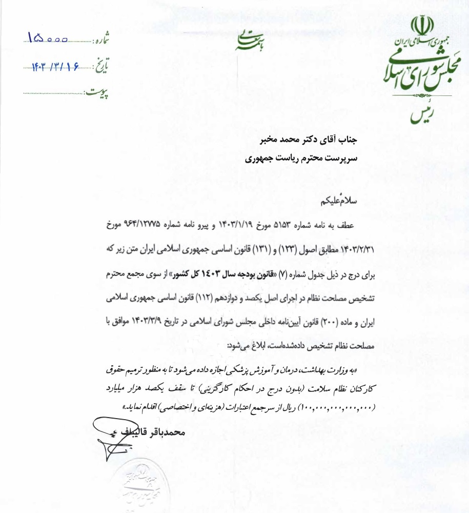 به گزارش پایگاه خبری پزشکان و قانون (پالنا)، "محمد مخبر" اصلاحیه قانون بودجه ۱۴۰۳ کل کشور را در خصوص ترمیم حقوق کارکنان نظام سلامت را در تاریخ ۲۱ خرداد به سازمان برنامه و بودجه کشور ابلاغ کرد.