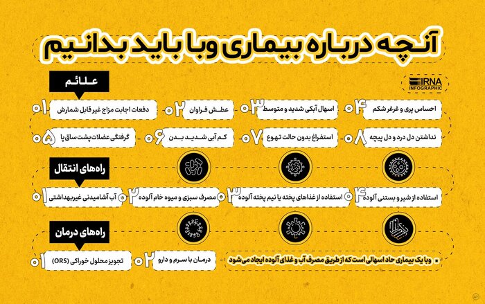 ۱۸- در صورتی که فرد مبتلا به وبا به موقع به پزشک مراجعه کند درمان قطعی این بیماری امکان پذیر است. ایرنا
