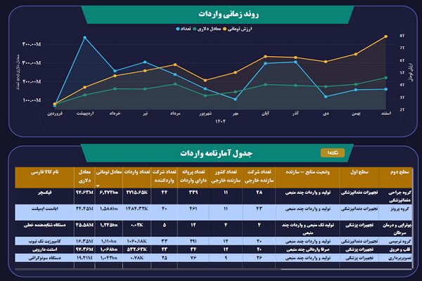 این آمارنامه برای دومین سال متوالی در تیر ماه سال جاری رونمایی شد که در آن دادههای کامل واردات تجهیزات و ملزومات پزشکی اعم از تعداد اقلام وارد شده تعداد شرکتهای واردکننده، ارزش دلاری و ریالی واردات هرکدام از کالاها قابل دسترسی است. مطابق توضیحات ارائه شده در افزونه جدید این داشبورد ارزش ریالی از حاصلضرب سه عامل معادل دلاری، نرخ ارز متناظر و ضرایب سود و هزینه مصوب تأمینکنندگان توزیعکنندگان و مصرفکنندگان محاسبه شده است.
