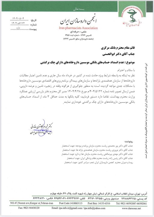 شهرام کلانتری خاندانی رئیس انجمن داروسازان ایران در نامه‌ای از بانک مرکزی خواست جهت جلوگیری از هرگونه وقفه در زنجیره تأمین و عرضه دارو، حساب‌های بانکی موسسین داروخانه‌های دارای چک برگشتی در تمامی بانک‌ها به مدت حداقل ۳ ماه مسدود نگردد.