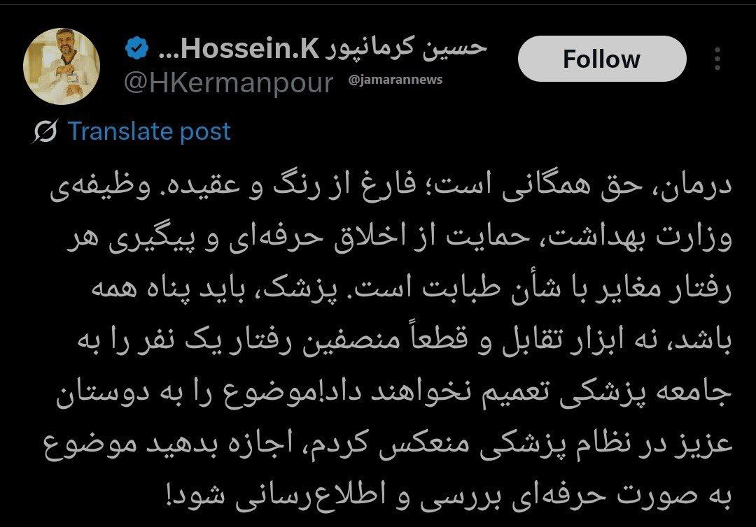 به گزارش پایگاه خبری پزشکان و قانون (پالنا)، حسین کرمانپور با انتشار مطلبی در شبکه اجتماعی ایکس در واکنش به اینکه یک پزشک حاضر به درمان یک فعال سیاسی به خاطر عقایدش نشده است نوشت: وظیفه وزارت بهداشت نیز حمایت از اخلاق حرفهای و پیگیری هر رفتار مغایر با شأن طبابت است.