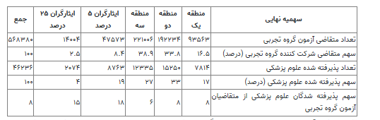 مقایسه تعداد متقاضیان گروه تجربی و تعداد پذیرفته شدگان علوم پزشکی نشان میدهد، ۷۳ درصد از کل پذیرفته شدگان علوم تجربی، در رشتههای علوم پزشکی پذیرفته شدهاند و علیرغم تعداد بسیار بیشتر مؤسسات آموزش عالی وابسته به وزارت علوم، بیشتر پذیرفته شدگان علوم تجربی در دانشگاهها و دانشکدههای علوم پزشکی تحصیل میکنند.