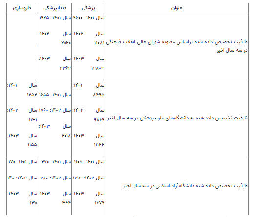 بررسی ظرفیت سه سال اخیر در رشتههای پزشکی، دندانپزشکی و داروسازی نشان میدهد در رشته پزشکی در سه گروه ظرفیت تخصیص داده شده بر اساس مصوبه شورای عالی انقلاب فرهنگی و ظرفیت تخصیص داده شده دانشگاههای علوم پزشکی و ظرفیت دانشگاه آزاد با افزایش مواجه بوده است. این موضوع در رشته دندانپزشکی نیز به همین ترتیب است.