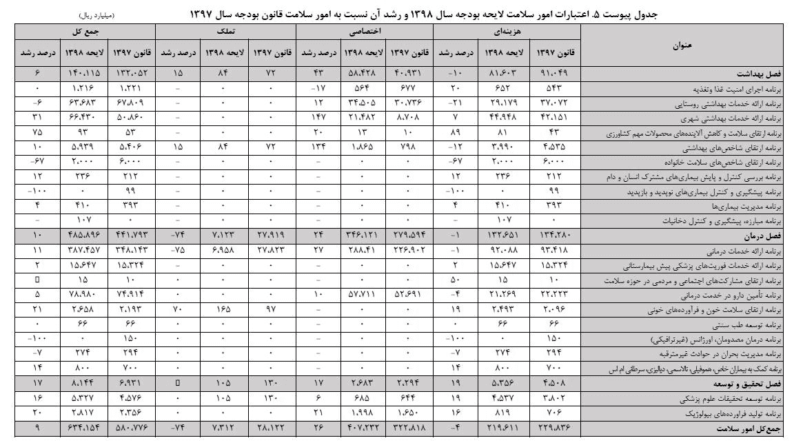 در بخش دیگری از گزارش بازوی کارشناسی مجلس درباره اعتبارات برنامه های امور سلامت در سال آینده آمده است: «اعتبارات امور سلامت در لایحه بودجه سال ۱۳۹۸ معادل ۶۳۴.۱۵۴ میلیارد ریال است که نسبت به بودجه سال ۱۳۹۷، ۹ درصد رشد داشته است. اعتبارات امور سلامت مشتمل بر اعتبارات فصل بهداشت، فصل درمان و فصل تحقیق و توسعه است که بیشترین رشد نسبت به سال ۱۳۹۷ به میزان ۱۷، ۱۰ و ۶ درصد به ترتیب مربوط به فصول تحقیق و توسعه، درمان و بهداشت است. سهم فصلهای بهداشت، درمان و تحقیق و توسعه از کل اعتبارات به ترتیب ۲۲، ۷۷ و ۱.۳ درصد است. سهم فصل بهداشت در لایحه بودجه سال ۱۳۹۸ نسبت به بودجه سال ۱۳۹۷ کاهش یافته ولی سهم فصول درمان و تحقیق و توسعه رشد مثبت داشتهاند. لذا میتوان گفت رویکرد درمان محوری هنوز در تقسیم منابع مالی نظام سلامت حاکم است».