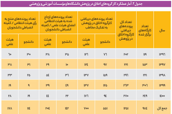 براساس داده های این جدول درمجموع ۱۲۵۱ پرونده توسط کارگروه های اخلاق در پژوهش دانشگاه ها و سایر مؤسسات آموزشی و پژوهشی دریافت شده است. از این تعداد، ۳۴۶ پرونده به هیئت انتظامی اعضای هیات علمی/ کمیته انضباطی دانشجویان ارجاع شد که ۲۰۴ مورد یعنی حدود ۶۰ درصد از پرونده ها مربوط به اعضای هیات علمی بوده است.