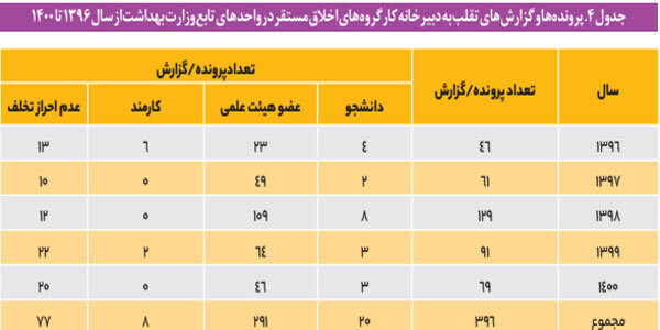 از سال ۱۳۹۶ تا ۱۴۰۰ در مجموع ۳۹۶ پرونده و گزارش تقلب به دبیرخانه کارگروه های اخلاق مستقر در واحدهای تابع وزارت بهداشت ارجاع داده شد که درخصوص ۷۷ مورد تخلف محرز نشد. از ۳۱۹ مورد تخلف محرز شده که بالغ بر ۹۰ درصد آنها مربوط به اعضای هیات علمی بوده است.
