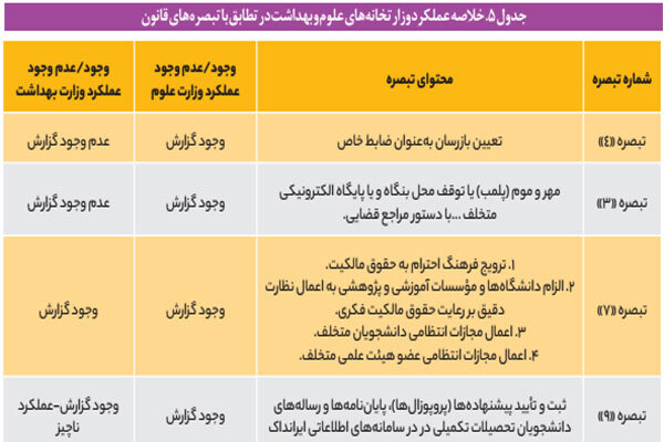 خلاصه عملکرد وزارتخانه های علوم و بهداشت در تطابق با تبصره های قانون
