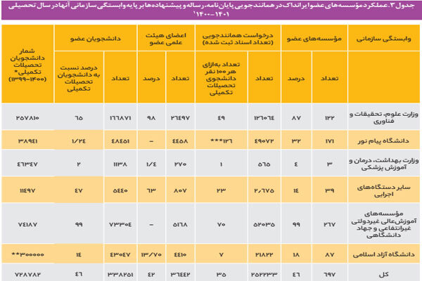 این وزارتخانه در سال ۱۳۹۹ نیز تعداد مقاله های مورد شکایت تا این سال را ۱۵۰۰ مورد و تعداد پایان نامه ها و رساله ها را ۵۰۰۰ مورد گزارش کرده بود. عدم تغییر این تعداد نشان دهنده افت عملکرد این وزارتخانه در راستای تبصره ۳ قانون از سال ۱۳۹۹ تا ۱۴۰۱ است.