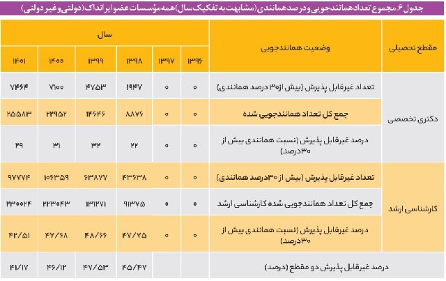 البته برای مقطع کارشناسی ارشد در سال ۱۴۰۰ کاهش اندکی در تعداد پارساهای غیرقابل پذیرش مشاهده می شود. نکته بسیار مهمی که بسیار بیشتر از روند رشد "پارساهای غیرقابل پذیرش" اهمیت دارد سهم آنها از کل پارساهای همانندجویی شده است که بالای ۴۰ درصد است و این میزان وضعیت بسیار نامطلوبی به لحاظ رعایت اخلاق علمی و حقوق مالکیت فکری است.
