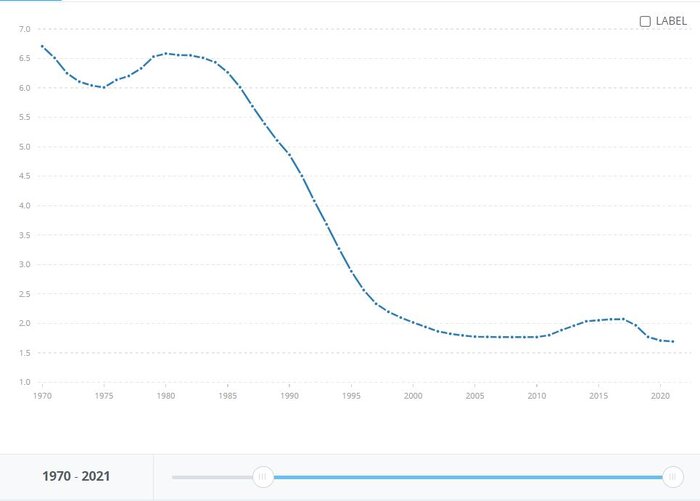 میزان باروری ایران از سال ۱۹۷۱ "۱۳۵۰" تا ۲۰۲۱ "۱۴۰۰" منبع: سایت بانک جهانی